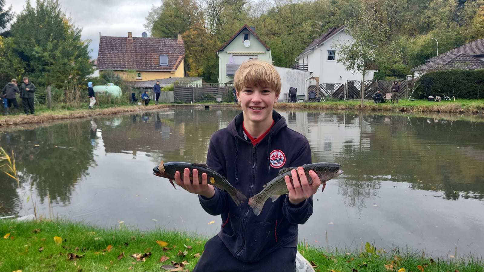 Um 14 Uhr hatten dann Passivmitglieder die Gelegenheit, selbst einmal aktiv mit der Rute auf Fischfang zu gehen. Mit je einem Paten ausgestattet konnten die 9 Teilnehmer 27 Forellen und 2 Schleien anlanden.